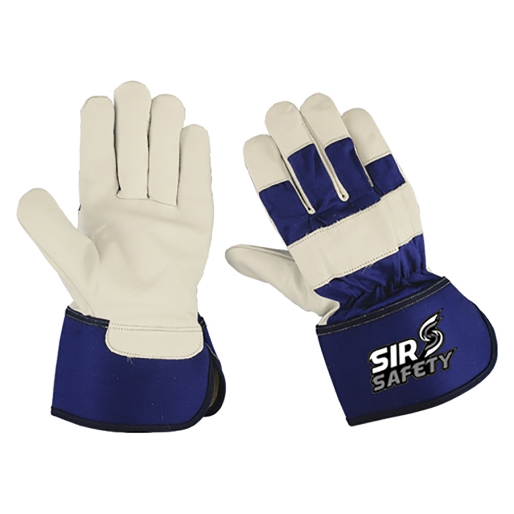 Palm curst cowhide leather gloves four finger tips royal blue cotton fabric back and shirred elastic on back wing thumb index finger rubberized cuff blue piping.